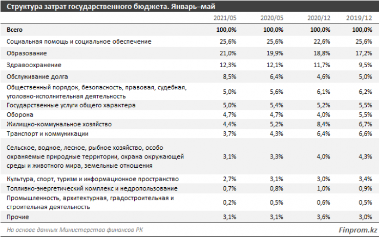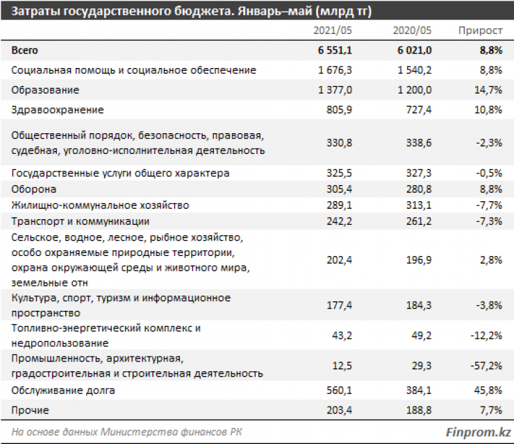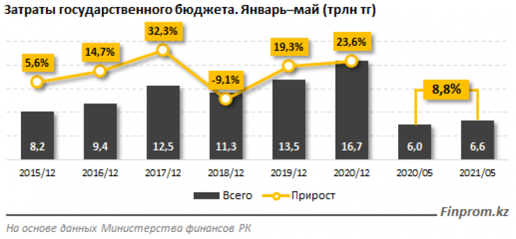 За январь - май 2021 года затраты государственного бюджета выросли до 6,6 триллиона тенге, плюс 8,8 процента за год. За январь - декабрь 2020-го затраты составляли 16,7 триллиона тенге - сразу на 23,6 процента больше, чем годом ранее.