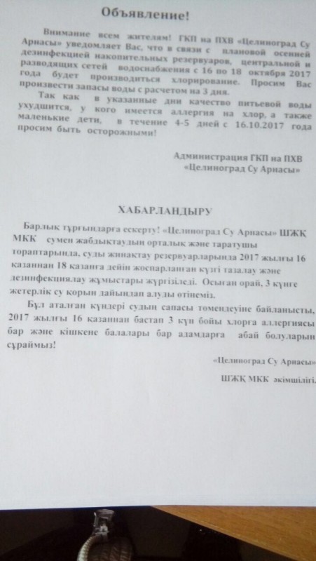 Фотографию с предупреждением, рассылали друг другу пользователи социальных сетей. В информации указано, что 16-17 октября 2017 года коммунальными службами будет производится хлорирование воды. При этом не указано, в каком районе или городе это будет происходить.