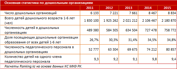 Педагогический персонал за 2015 год увеличился на 9 процентов, до 80,9 тысячи человек. На одного представителя педперсонала приходилось 9,4 ребенка (в 2014 было 9,8). Лучший показатель отмечен в Кызылординской области - всего 7,4 ребенка на воспитателя.