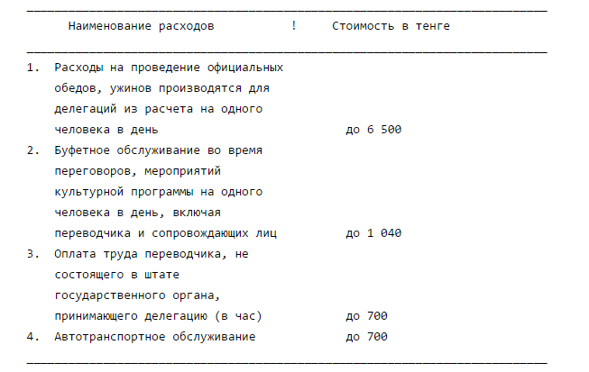 Там же отмечается, что расходы на обслуживание иностранных делегаций автомобильным транспортом предусматриваются в сметах расходов из расчета почасовой оплаты. "Во время обеда, ужина или другого аналогичного мероприятия, связанного с официальным приемом иностранных делегаций, количество участников со стороны Республики Казахстан не должно превышать количество участников со стороны иностранных делегаций", - говорится в тексте постановления.
