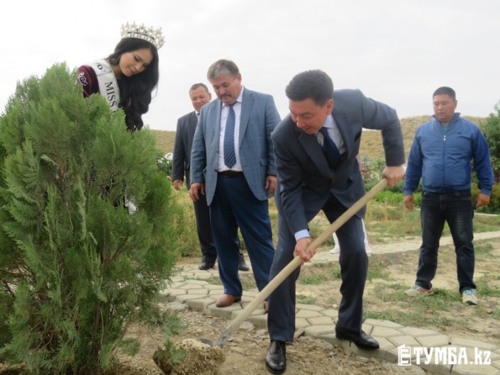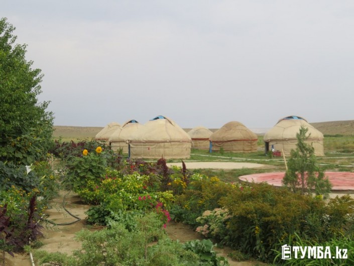 На территории этноаула уже высажено около 600 деревьев и кустарников, цветы. К следующему сезону в парковой зоне наполнится водой подготовленный декоративный пруд. Среди растений есть и туя, посаженная акимом области.