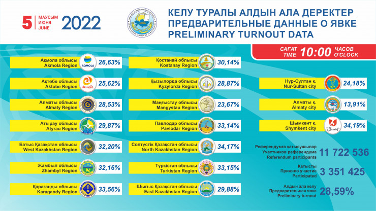 По данным на 10.00 на референдуме проголосовало 3 миллиона 351 тысяча 425 казахстанцев.