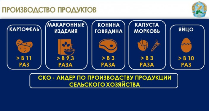 За четыре года объем валовой продукции сельского хозяйства вырос в полтора раза - с 411 миллиардов тенге в 2016 году до 630 миллиардов тенге в 2019 году. В 2019 году открылись новые предприятия по переработке зерновых и масличных культур, мяса, производству комбикормов. С 2016 года площади масличных культур увеличены в два раза и составляют один миллион гектаров. В этом году североказахстанские аграрии в непростых погодных условиях смогли вырастить и собрать более 5,1 миллиона тонн зерна.