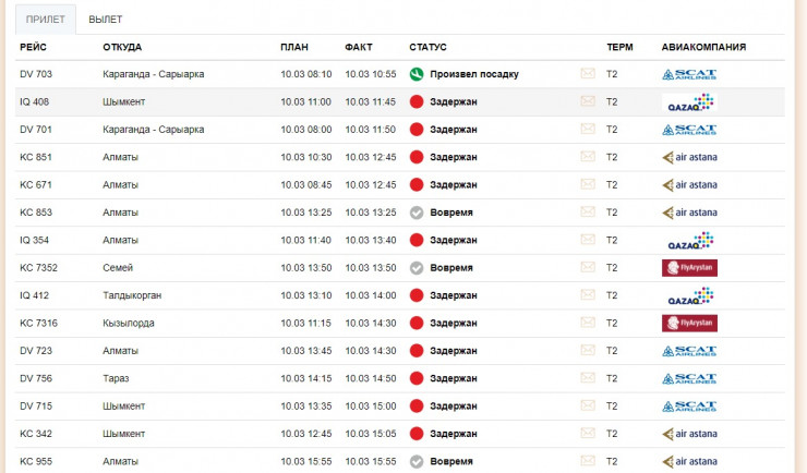 Онлайн-табло с сайта аэропорта Нур-Султана