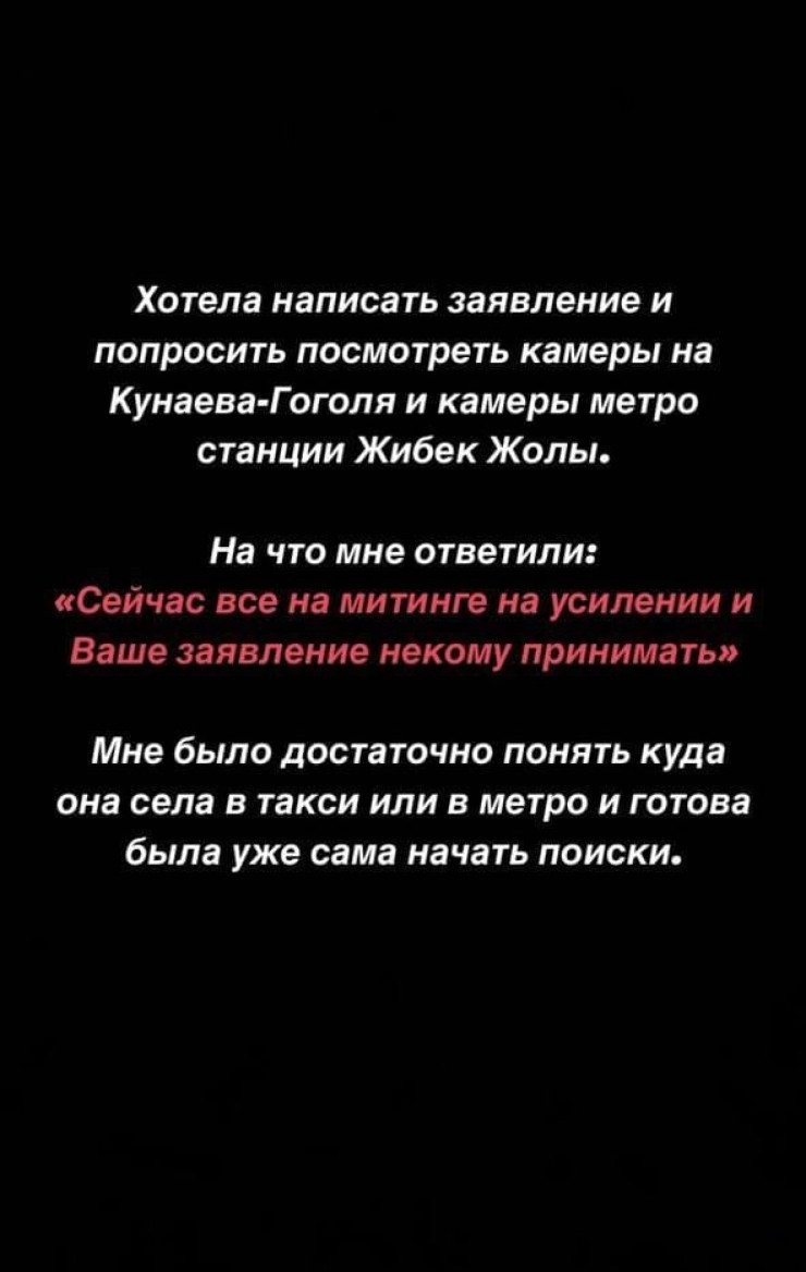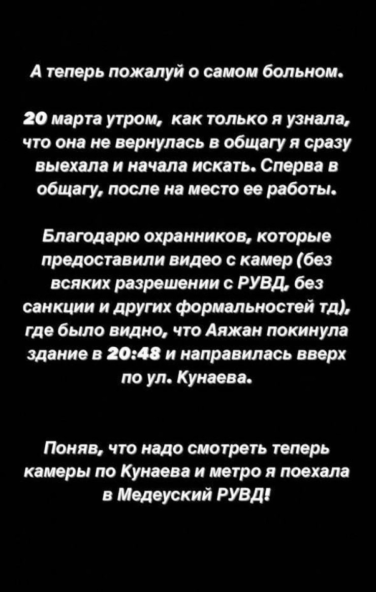 Утром 20 марта начались поиски, родственники заявляли в полицию в 12.00, но там сначала заявление не брали, объясняя большой занятостью из-за усилений на митингах. Подключились друзья и волонтеры. Они стали делать запросы в службы такси. Брат Аяжан в 15.00 позвонил в 102 и заявил о пропаже девушки, после этого их вызвали на место работы, где Аяжан видели последний раз, это уже было примерно 17.00", - говорится в публикации #НемолчиKZ.