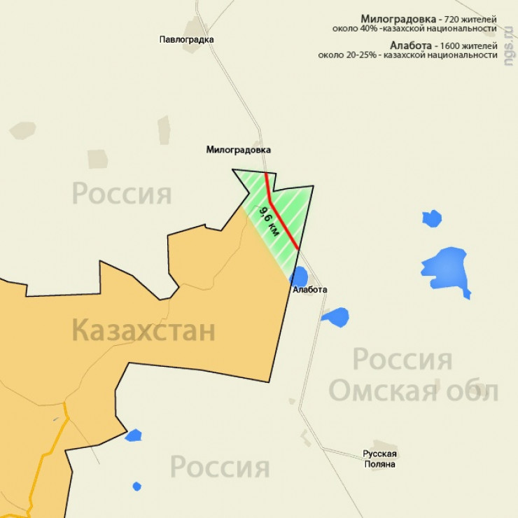 Между селами Милоградовка и Алабота в Омской области напрямую около 15 километров, но большая часть дороги, которая соединяет эти российские села, до осени 2020 года пролегала по территории Северо-Казахстанской области.