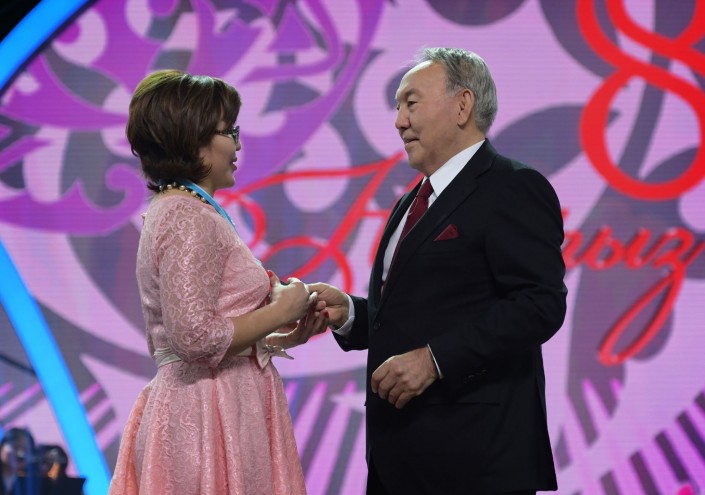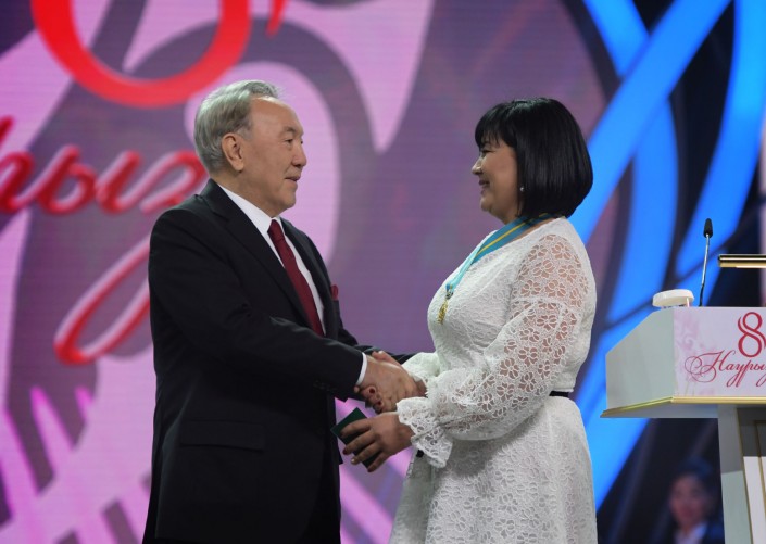 После поздравительной речи Президент вручил многодетным матерям  нагрудные знаки "Алтын алқа" и "Күміс алқа". Жительница Южно-Казахстанской области Айгуль Тузельбаева была удостоена золотой подвески, а жительница Астаны Раушан Аяганова - серебряной.