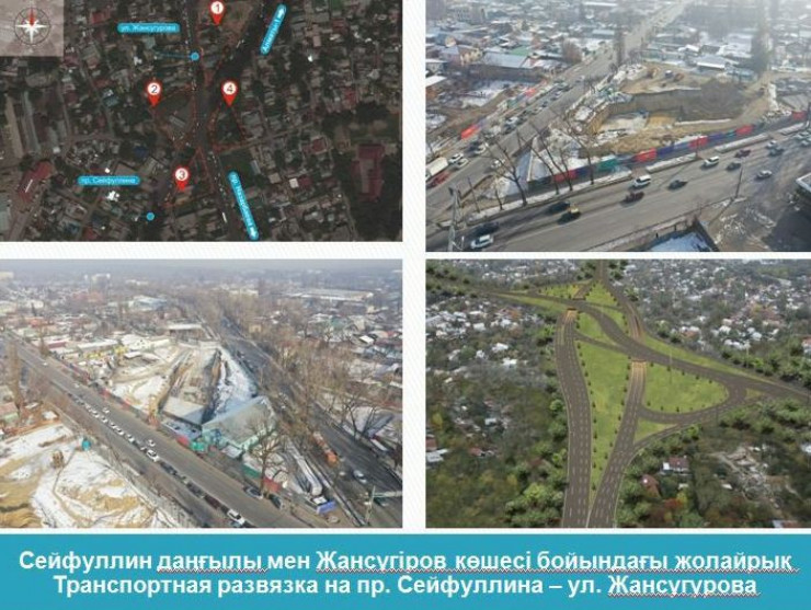 Летом 2017 года стали известны сроки открытия транспортной развязки на Сейфуллина - Жансугурова. Завершение строительства было запланировано на четвертый квартал 2019 года. Тогда отмечалось, что возведение развязки "позволит увеличить пропускную способность участка на 20 процентов".