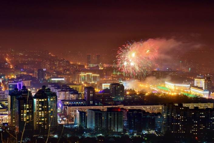 Тем временем в Алматы погода радовала горожан, на улице 7-10 градусов тепла. Яркий фейерверк был запущен с площади Республики.