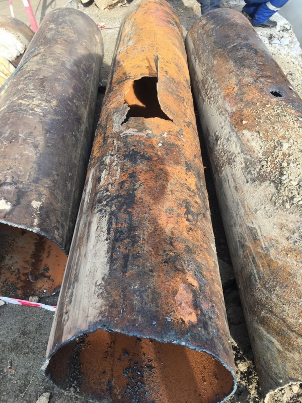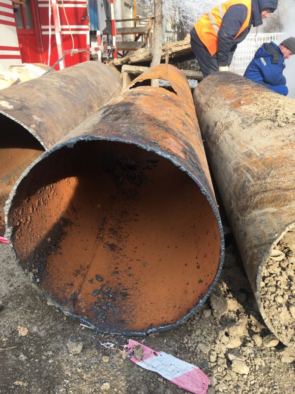 По его словам, порыв трубы случился из-за ее изношенности. "Явное повреждение, трубы сгнили, свой эксплуатационный ресурс отработали. Посмотрите, какая труба должна быть, а тут какая толщина. Давление не выдерживает, и произошло повреждение", - объяснил он. Работы все еще продолжаются.