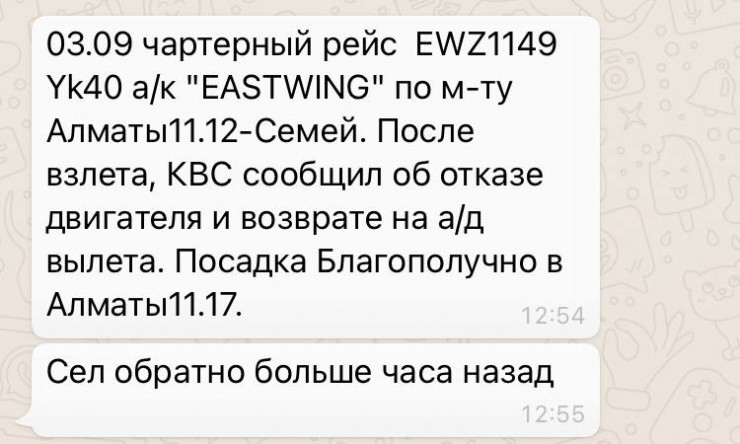 "Самолет авиакомпании East Wing вылетел из Алматы в Семей. После взлета в 11.12 командир доложил об отказе левого двигателя и возвращении на а/д вылета. Посадка благополучно произошла в 11.17. На борту находились пять членов экипажа и два врача", - рассказали в пресс-службе МИИР.