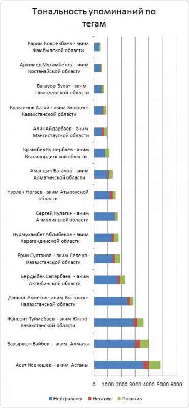 Так, в рейтинге упоминаемости ожидаемо лидируют акимы: Асет Исекешев - 4 871 упоминание и Бауыржан Байбек - 3 946. Публикации в СМИ с упоминание имени Асета Исекешева касались тем строительства легкорельсовых трамваев, реализации проекта по управлению парковочным пространством и в целом системного развития транспортного комплекса Астаны. В статьях писали не только о реконструкции ливневой канализации города, но и о подготовке к проведению международной выставки "ЭКСПО-2017". Только в СМИ деятельность столичного акима освещалась в 1 433 публикациях.