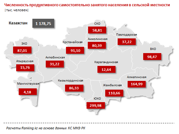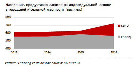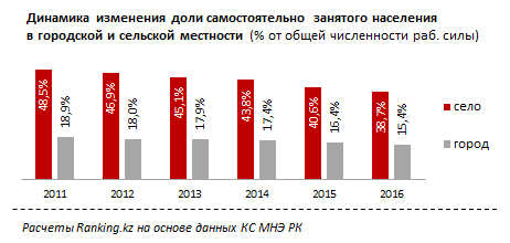 По итогам 2016 года, в структуре рабочих ресурсов в городах РК всего 15,4 процента составляет самостоятельно занятое население. В то время как в сельской местности уровень самостоятельной занятости значительно выше - почти 39 процентов экономически активного населения работает на себя.