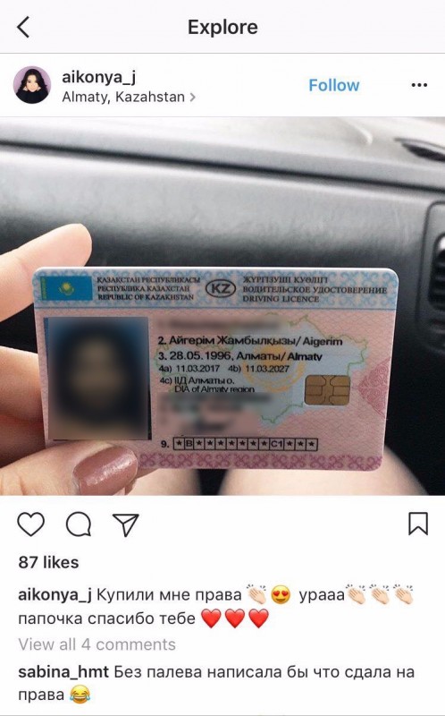 Позже отец рассказал, что девушка получила права в Алматинской области и сама сдавала экзамен. С его слов, якобы официальную госпошлину в размере 1,25 МРП (2 836 тенге) за права она восприняла как покупку.