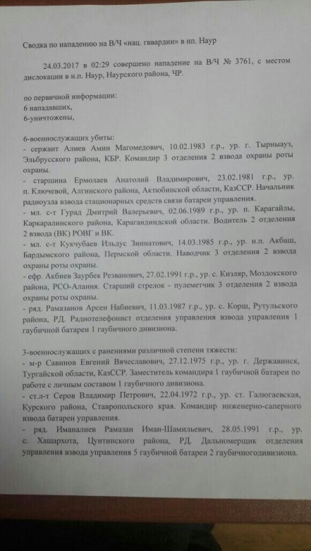 В ночь с 23 на 24 марта группа вооруженных людей напала на часть Национальной гвардии России в Наурском районе Чечни. По официальной версии, в ходе перестрелки шестеро бандитов были ликвидированы. В результате атаки террористов погибли шесть военнослужащих Нацгвардии, трое получили ранения.