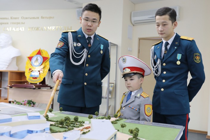 В Национальном военно-патриотическом центре Алидар встретился с воспитанниками республиканского военно-патриотического движения "Жас сарбаз" и ознакомился с экспонатами Военно-исторического музея. Также мальчик посетил элитную войсковую часть Десантно-штурмовых войск.