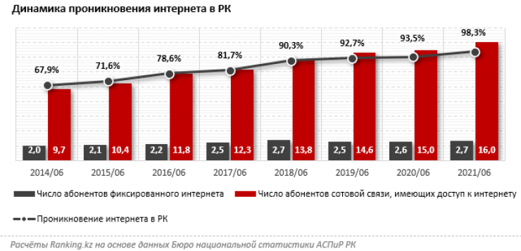 Выдержать длительное дистанционное обучение в Казахстане было возможно благодаря существующей инфраструктуре, в первую очередь - доступности интернета. По итогам первого полугодия текущего года проникновение интернета в стране составляло 98,3 процента. При этом в основном в республике пользуются мобильным интернетом. Так, к концу июня в стране насчитывалось 16 миллионов абонентов сотовой связи, имеющих доступ к интернету, на 6,9 процента больше аналогичного периода прошлого года.