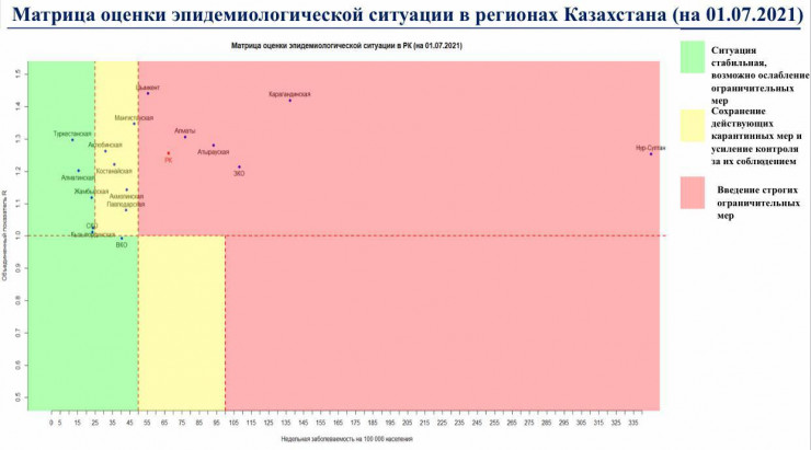 Согласно матрице оценки эпидемиологической ситуации в регионах Казахстана на 1 июля, в "красной" зоне находятся Нур-Султан, Алматы, Шымкент, Атырауская, Западно-Казахстанская и Карагандинская области.