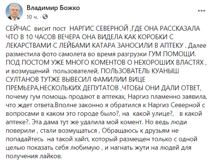 Отметим, что на пост отреагировал заместитель председателя Мажилиса Владимир Божко.