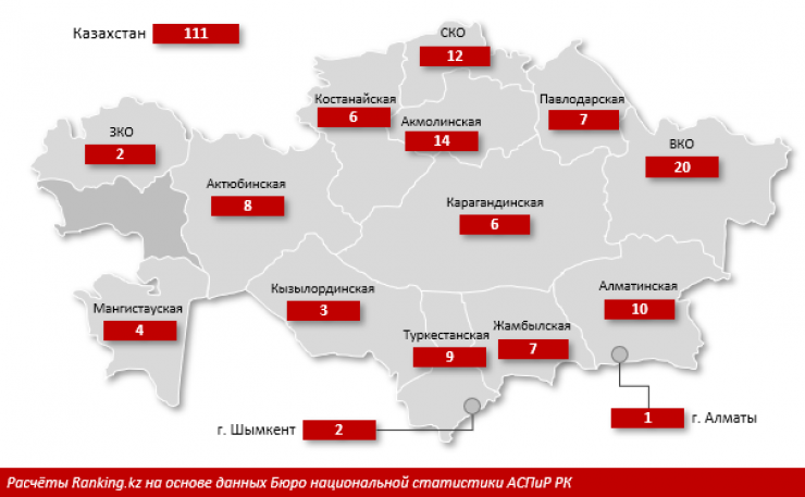 Больше всего лагерей расположено в Восточно-Казахстанской области - 20 объектов. Далее идут Акмолинская и Северо-Казахстанская области - 14 и 12 лагерей соответственно. Меньше всего лагерей расположено в Алматы - всего один. Кроме того, в двух регионах - Атырауской области и Нур-Султане - такие детские объекты в принципе отсутствуют.