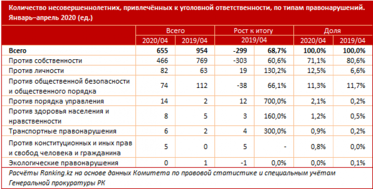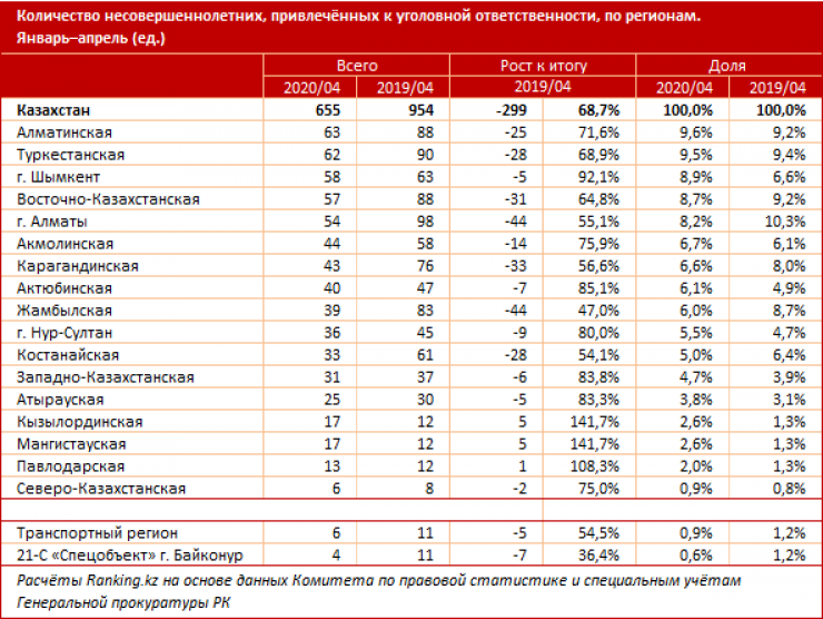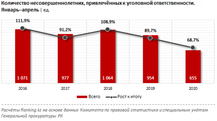 За январь – апрель 2020 года в Казахстане к уголовной ответственности привлекли 655 несовершеннолетних - на 31,3 процента меньше, чем годом ранее (954 случая). 82,6 процента из них достигли возраста 16-17 лет, еще 17,4 процента - в возрасте 14-15 лет. Из общего количества привлеченных к уголовной ответственности несовершеннолетних было 60 девушек. В январе – апреле 2019 года было 59 девушек, передает Tengrinews.kz со ссылкой на Ranking.kz