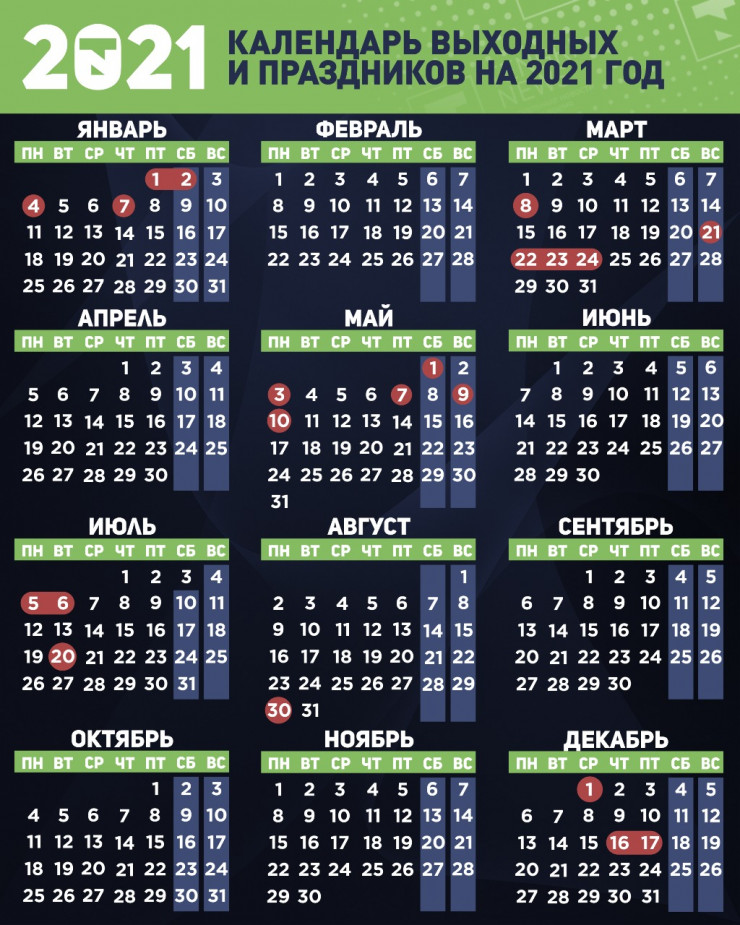 Всего в 2021 году жители страны при пятидневной рабочей неделе получат 245 рабочих и 120 выходных дней. Больше всего выходных выпало на январь и май.