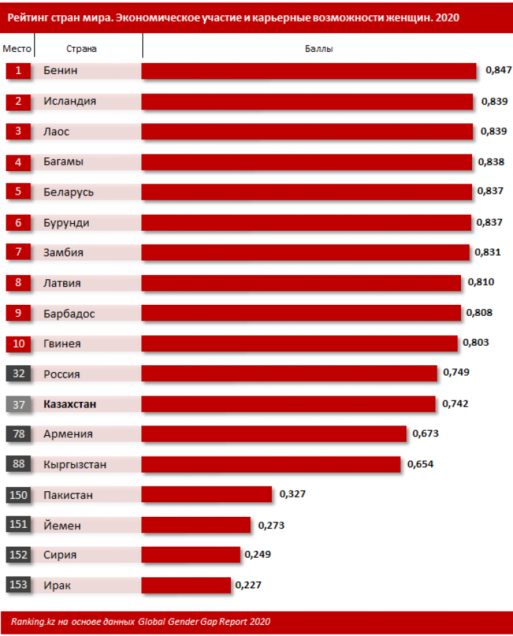По экономическому участию и карьерным возможностям женщин Казахстан занимает 37-е место в мире из 153, при этом среди стран ЕАЭС Беларусь занимает пятое место в мире, а Россия - 32-е. Ниже Казахстана расположились Армения (78-е место) и Кыргызстан (88-е место).