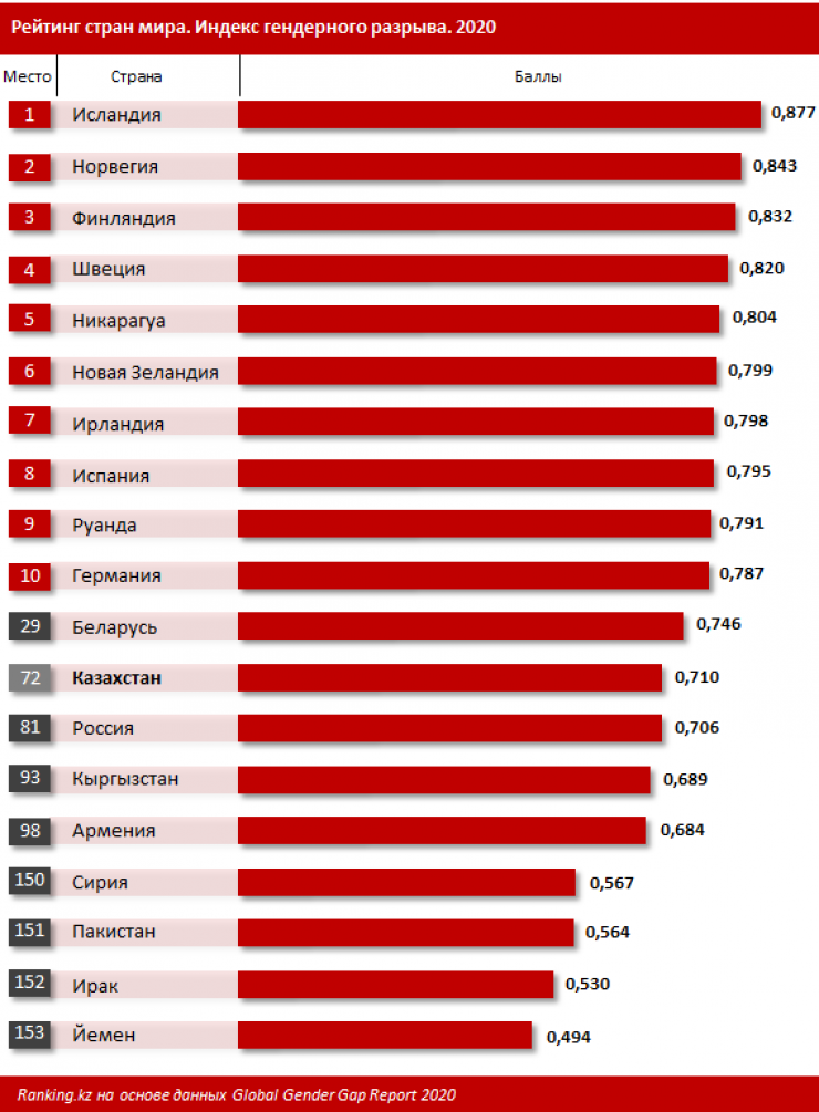 Согласно данным Всемирного экономического форума, где измеряется степень существующего разрыва по гендерному признаку, Казахстан занимает в мировом рейтинге по этому показателю 72-е место из 153. Среди стран ЕАЭС ситуация лучше только в Беларуси - 29-е место в рейтинге. Россия на 81-м месте, Кыргызстан - на 93-м, а Армения - на 98-м.