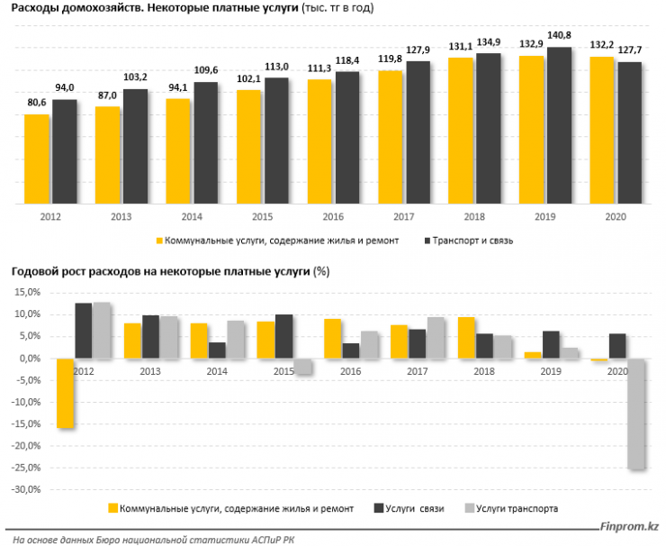 Расходы ожидаемо сократились практически по всем видам услуг, исключение составили услуги связи - плюс 5,7 процента, до 76,6 тысячи тенге.