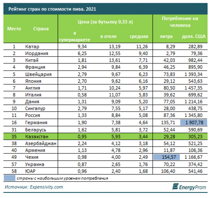 Ниже, чем в Казахстане, цены на пиво в Азербайджане (38-е место), Армении (40-е место), Украине (57-е место).
