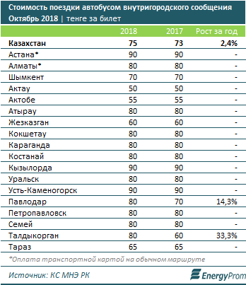 По итогам октября 2018 года стоимость внутригородского автобусного проезда выросла в среднем по стране на 2,4 процента за год. Сразу на 33,3 процента подорожал проезд в Талдыкоргане (с 60 до 80 тенге), на 14,3 процента - в Павлодаре (с 70 до 80 тенге).
