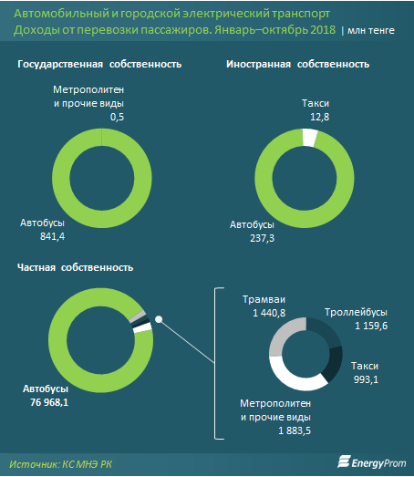 Кроме того, по итогам 10 месяцев 2018 года наибольшее поступление доходов наблюдалось в частном секторе. Так, доходы частников от перевозки пассажиров составили 82,5 миллиарда тенге, из которых почти 77 миллиардов тенге приходится на перевозки автобусами.