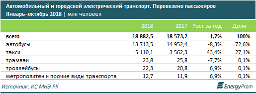Основная доля автомобильного и городского электрического транспорта пришлась на автобусы: 72,6 процента. При этом автобусные перевозки сократились сразу на 8,3 процента за год. А вот услугами такси воспользовались на 43 процента пассажиров больше, чем годом ранее. Всего за 10 месяцев 2018 года на автомобильном и городском электрическом транспорте перевезли 18,9 миллиарда пассажиров.