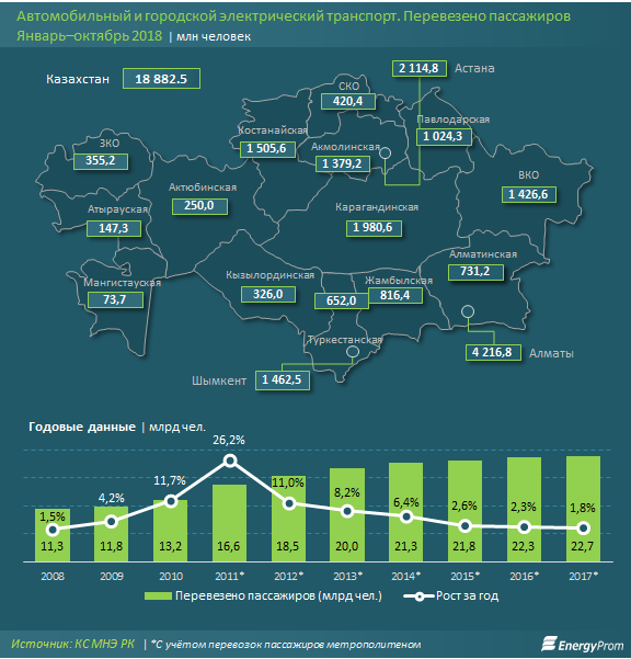 Наибольший рост перевозок пассажиров пришелся на Кызылординскую область: +8,7 процента за год, до 326 миллионов человек. Это связано с открытием современного автобусного парка, рассчитанного на 200 единиц общественного транспорта. Для его строительства из бюджета было выделено 2 миллиарда тенге.