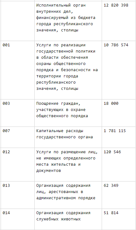 Из этой суммы (12,8 миллиарда тенге) основная часть (10,7 миллиарда тенге) приходится на  обеспечение охраны общественного порядка и безопасности на территории города.