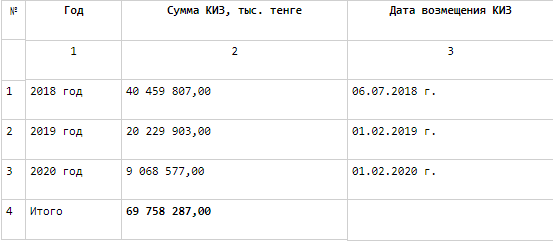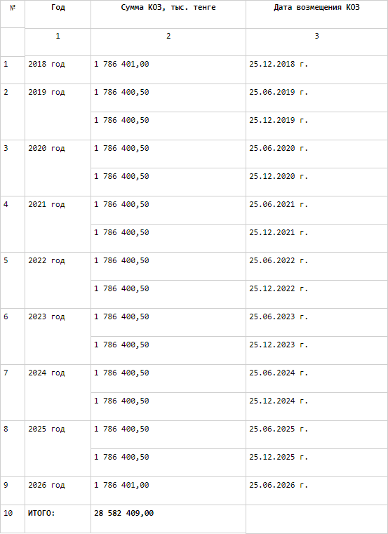 До 2020 года государство выплатит компенсацию по инвестиционным затратам в размере 69,7 миллиарда тенге. Выплаты по операционным затратам в размере 28,5 миллиарда тенге будут завершены в 2026 году.