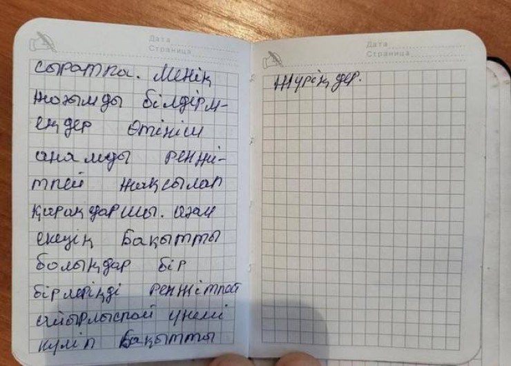 4 июня 19-летний солдат-срочник Едил Тешебаев умер в Мангистауской области. По официальной версии, он повесился - на шее у него было два ремня. Накануне смерти он позвонил домой и просил перевести ему 5000 тенге. Lada.kz опубликовала фотографии блокнота солдата, в записях он отдельно обращается к матери, отцу, братьям и родственникам.
