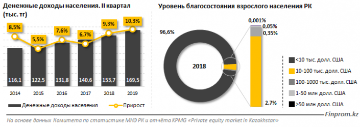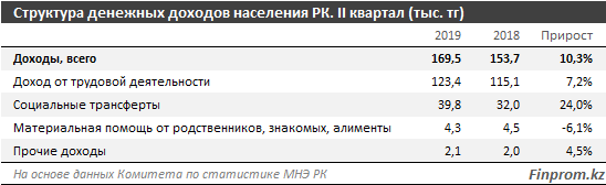 Отмечается, что во втором квартале текущего года средний денежный доход населения составил 169,5 тысячи тенге, это на 10,3 процента больше, чем в аналогичном периоде годом ранее (153,7 тысячи тенге).