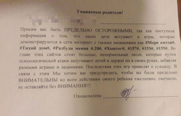 В листовке руководство учебного заведения просит родителей быть предельно осторожными и внимательными ко всем действиям своего ребенка каждый день и час. "Поступила информация о том, что наши дети вступают в игры, которые демонстрируются в сети интернет с такими названиями, как #Море китов#, #Тихий дом#, #Разбуди меня в 4:20#, #Хештег#, #157#, #153#, #155#. Во главе этих сайтов стоят больные ненормальные люди, которые путем психологической атаки запугивают детей и держат их в своих руках, забавляя разными играми и заданиями. Последствия этих игр приводят к суициду", - говорится в тексте.