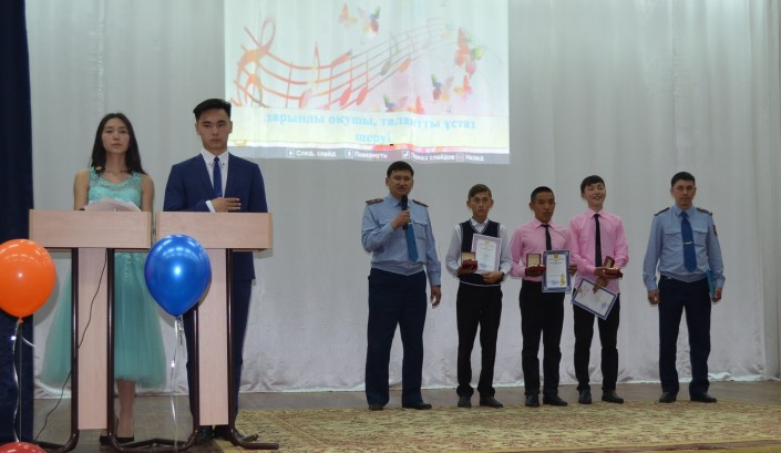 Благодарственные письма и наручные часы ученикам 9 класса средней школы № 2 села Караоткель Целиноградского района Жансерику Бакытжан, Аяну и Темирлану Пышинским полицейские вручили на торжественной линейке в присутствии педагогов и других учеников школы.