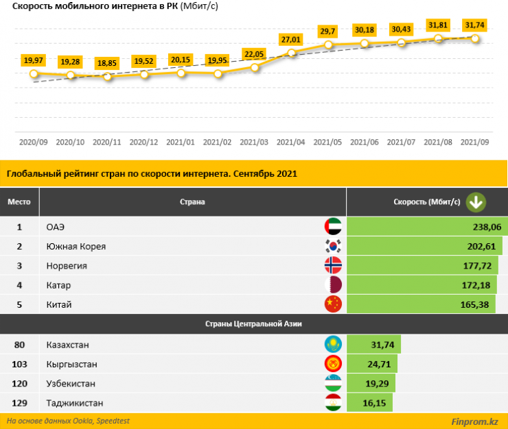 Аналитики finprom.kz сообщили, что в рейтинге стран по скорости мобильного интернета по итогам сентября Казахстан поднялся на три строчки за месяц и занял 80-е место. Всего за год страна улучшила позиции на 21 строчку. По данным рейтинга, скорость мобильного интернета в стране с начала года увеличилась на 62,2 процента, с 19,52 до 31,74 мегабит в секунду.