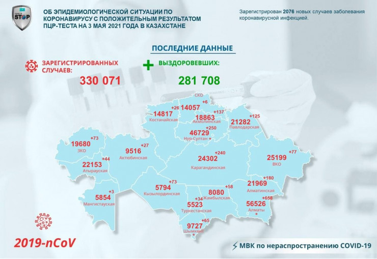 За прошедшие сутки (данные за 3 мая) в Казахстане зарегистрировано 2076 новых случаев заболевания коронавирусной инфекцией, сообщает Tengrinews.kz со ссылкой на МВК по нераспространению COVID-19.