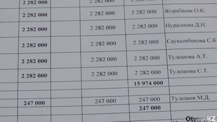 "Все они занимали эти должности формально. Никогда на работу не приходили, заработная плата их составляла по 2 миллиона 282 тысячи тенге в месяц. В то время, когда у нас были такие зарплаты у руководящих, простые рабочие получали по 25-28 тысяч тенге", - добавила начальник Отдела по управлению кадровыми и трудовыми отношениями.