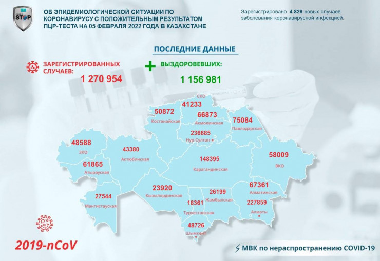В Казахстане за прошедшие сутки (5 февраля) зарегистрировано 4 826 новых случаев заболевания коронавирусной инфекцией, передает Tengrinews.kz со ссылкой на МВК по нераспространению COVID-19.