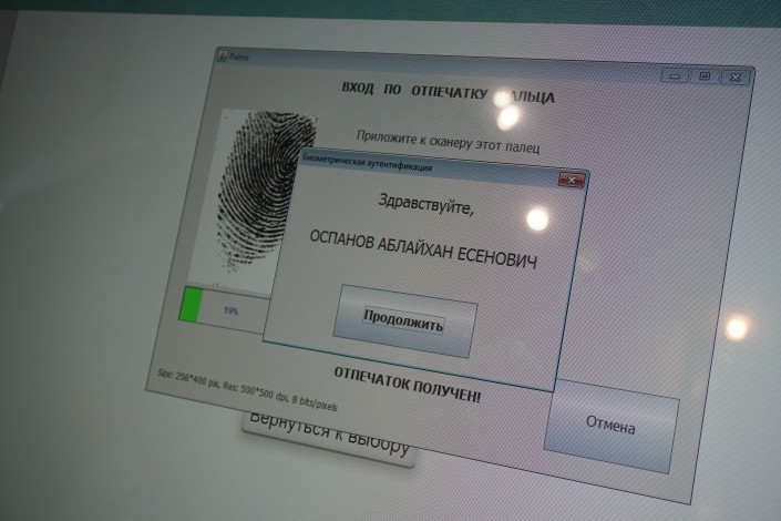Чтобы подтвердить личность, используя свои биоданные, необходимо приложить указательный палец к специальному сканеру красного цвета, который установлен в правом верхнем углу устройства.