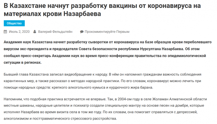 В Министерстве информации и общественного развития назвали фейком сообщение о том, что в Казахстане якобы разрабатывают сыворотку от коронавируса на базе образцов крови Нурсултана Назарбаева, передает корреспондент Tengrinews.kz.