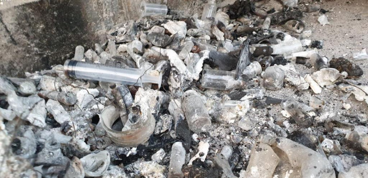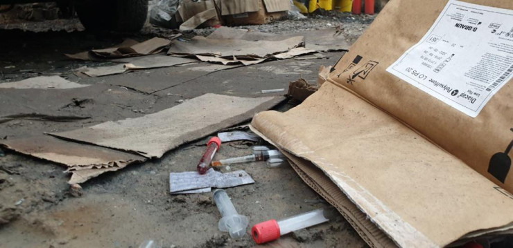 На земле, по их словам, были разбросаны сотни пакетов и бутылок, наполненных использованными шприцами и другими медотходами. Судя по кадрам, предоставленным экологами, в некоторых пробирках была жидкость, напоминающая кровь.
