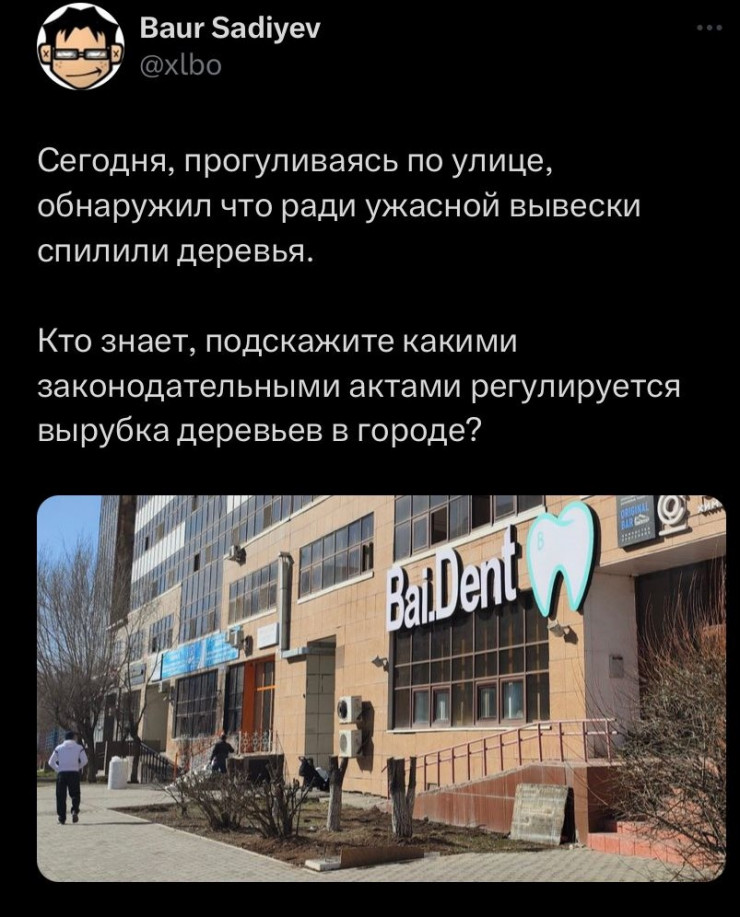 В пресс-службе акимата в ответе на запрос Tengrinews.kz заявили, что в данном случае разрешение на вырубку деревьев не выдавалось.