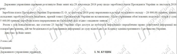 "Заработная плата президента Украины Петра Порошенко за ноябрь 2018 года начислена в размере должностного оклада - 28 тысяч гривен (373 тысячи тенге). Других составляющих заработной платы (надбавок, премий и тому подобного) президенту Украины не установлено", - говорится в ответе изданию на запрос в государственное управление делами Украины.