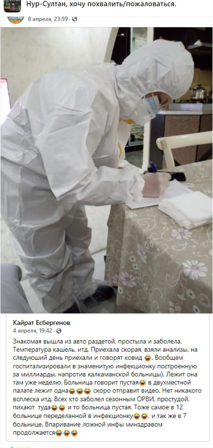 В социальных сетях казахстанцы высказывают мнение о том, что статистика заболеваемости коронавирусом искусственно раздута, а инфекционные больницы пустуют. В Министерстве здравоохранения опровергли информацию, сообщив, что инфекционные больницы страны загружены на 40 процентов, передает Tengrinews.kz со ссылкой на Stop Fake.